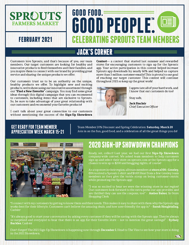 A special thank you to the core team members and department managers at store #219 for their outstanding leadership and support: Nate Ayala, Perishable Manager; Candace Martinez, Non-Perishable Manager; Myriam Lomeli, Service Manager; Vonnie Pombo, Scan Coordinator; Shawn Bittler, Receiver; Nick Grubbs, Produce Manager; Zac Guzman, Grocery Manager; Christina Bertacini, Vitamins Manager; Jordan Stroud, Deli Manager; Marcos Simental, Bakery Manager; Nick Tirone, Meat/Seafood Manager; Adam Piazza, Dairy Manager; and Chris Meadows, Service Manager.