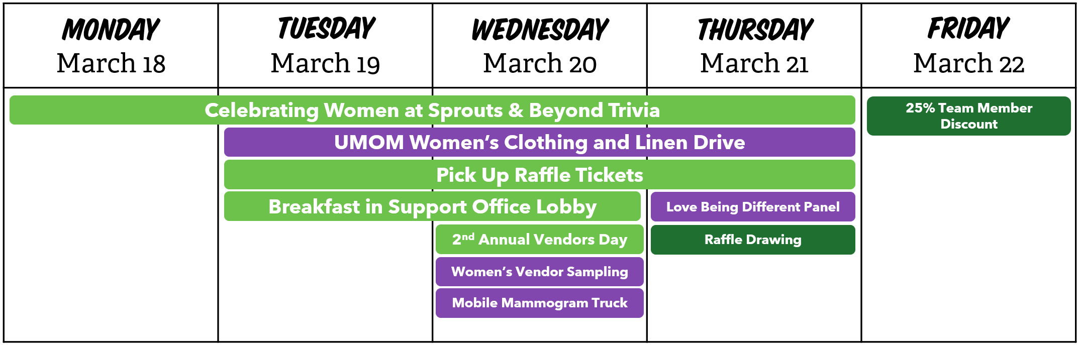 This quarter, for TMAW, we are partnering with Inspiring Women @ Sprouts (IWS) in honor of Women’s History Month. We are excited about this partnership and look forward to giving back to our communities! You can look forward to several amazing events during the week including raffles, vendor events, panel discussions, charitable donations, and more.