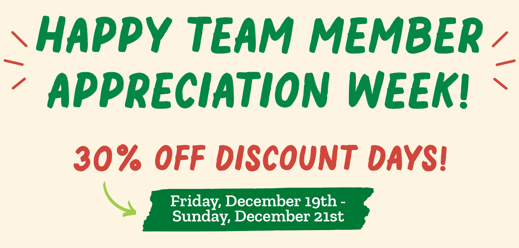 In recognition of our team members, we will celebrate YOU during Team Member Appreciation Week December 18 – 22, 2023! We appreciate you and look forward to enjoying some holiday cheer together!