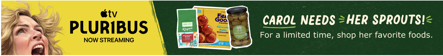 Two days of filming, 2 overnight shoots later, and lots of emptying shelves and Bulk bins, Sprouts has become part of the Pluribus story. Store #707 appears in two episodes, written directly into the script, and now – as the show debuts – Sprouts is celebrating by naming the show’s main character “Carol”, also a fan of Sprouts in the show, as its “Customer of the Month.”