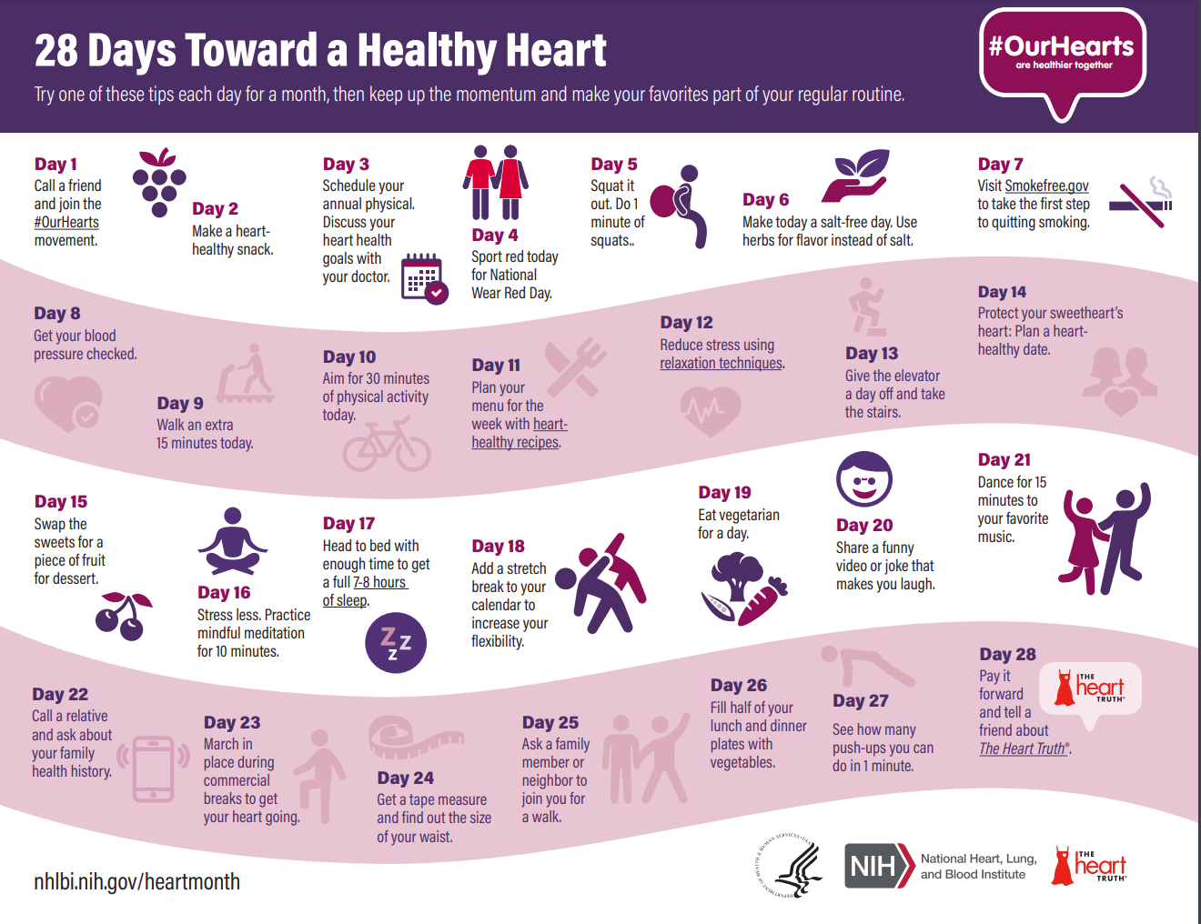 February is American Heart Month – a time dedicated to raising awareness to help people understand risk factors for heart disease and how to live a heart-healthy lifestyle. The National Institutes of Health offers this simple infographic, “28 Days Toward a Healthy Heart” that you can check find one helpful tip for each day of this month.