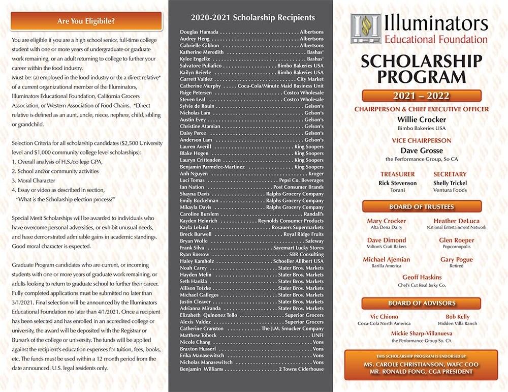 The Illuminators Educational Foundation provides college scholarships to further the education of members and families of the Illuminators, Western Association of Food Chains, and the California Grocers Association. All Sprouts team members who meet the criteria below are eligible for this scholarship opportunity!
