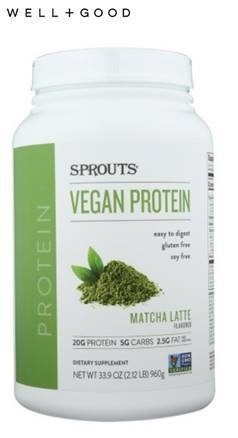 Top Vegan Protein: Well+Good shared Registered Dietitian Kelly Jones’ top vegan protein powder picks, highlighting Sprouts’ Matcha Latte Vegan Protein featuring a pea and rice protein base with 20 grams per scoop that’s sweetened with monk fruit extract.