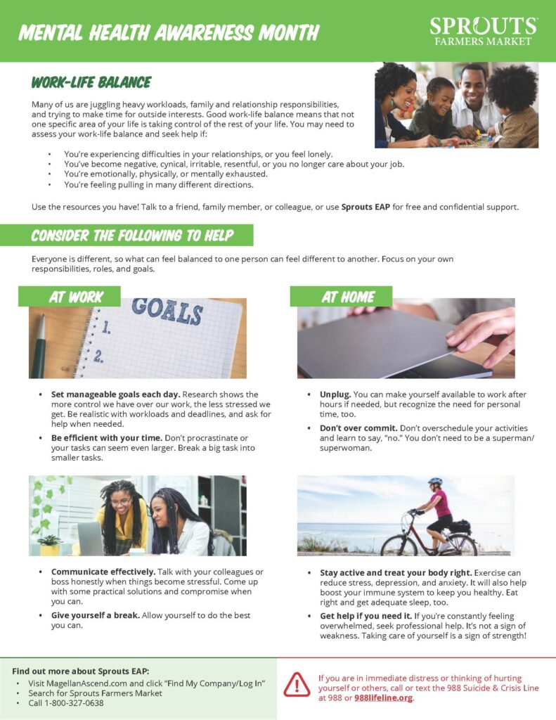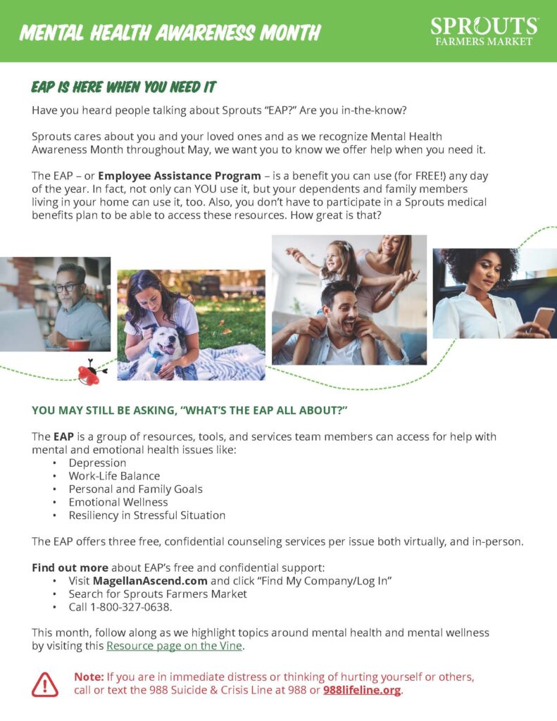 Watch the Vine all this month for information about this important subject. Remember, too, that Sprouts offers its Employee Assistance Program – or EAP – free to you and your dependents and family living in your home. The EAP offers virtual and in-person resources for help with stress, work-life balance, and much more.