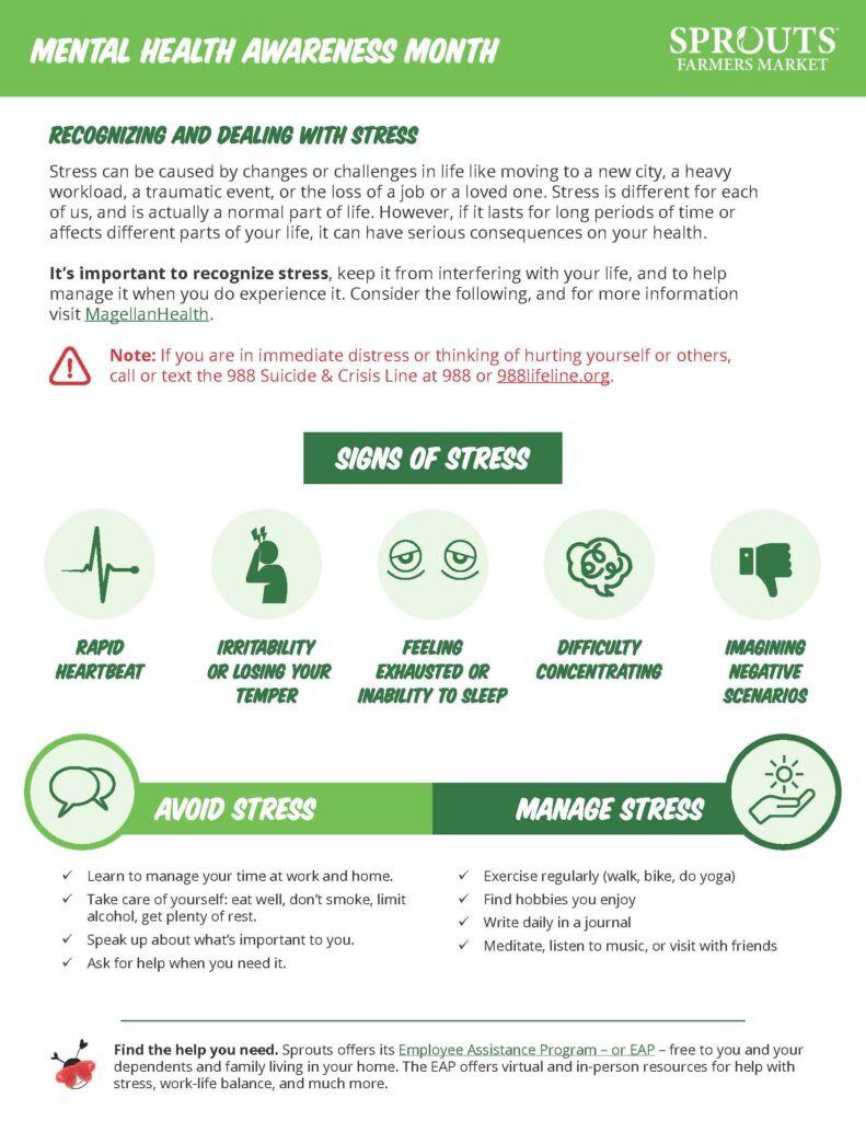 Mental health is important each day, all year, and the month of May is designated as a time to raise awareness about it. All month at Sprouts, we’ll be sharing information and resources for you on how to learn more about good mental health.