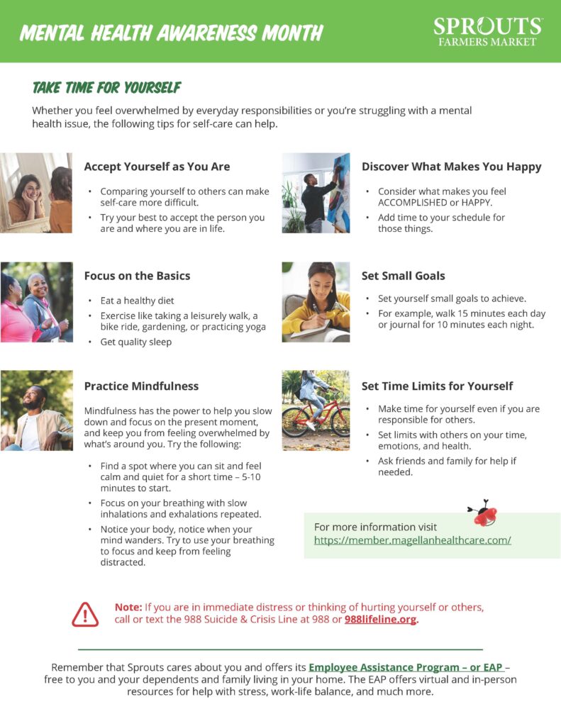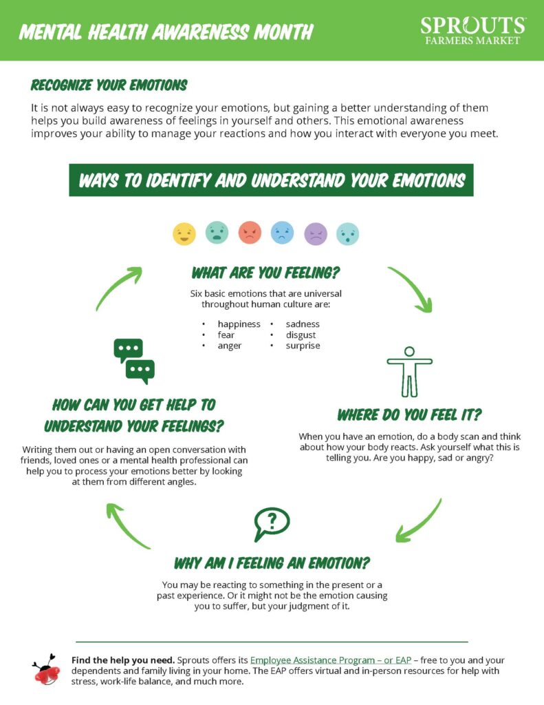 Mental health is important each day, all year, and the month of May is designated as a time to raise awareness about it. All month at Sprouts, we’ll be sharing information and resources for you on how to learn more about good mental health.