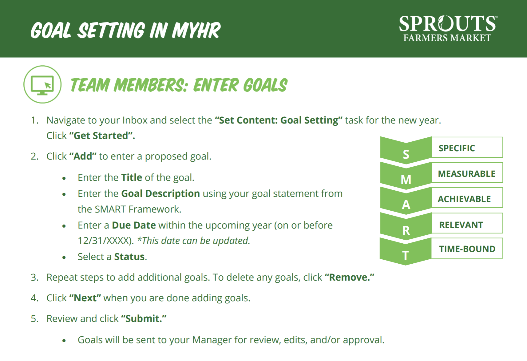 If you’re setting individual goals this month, connect with your leader to make sure you understand the priorities for your team, your department, and Sprouts as a whole. Great goals don’t just reflect your role—they support something bigger.