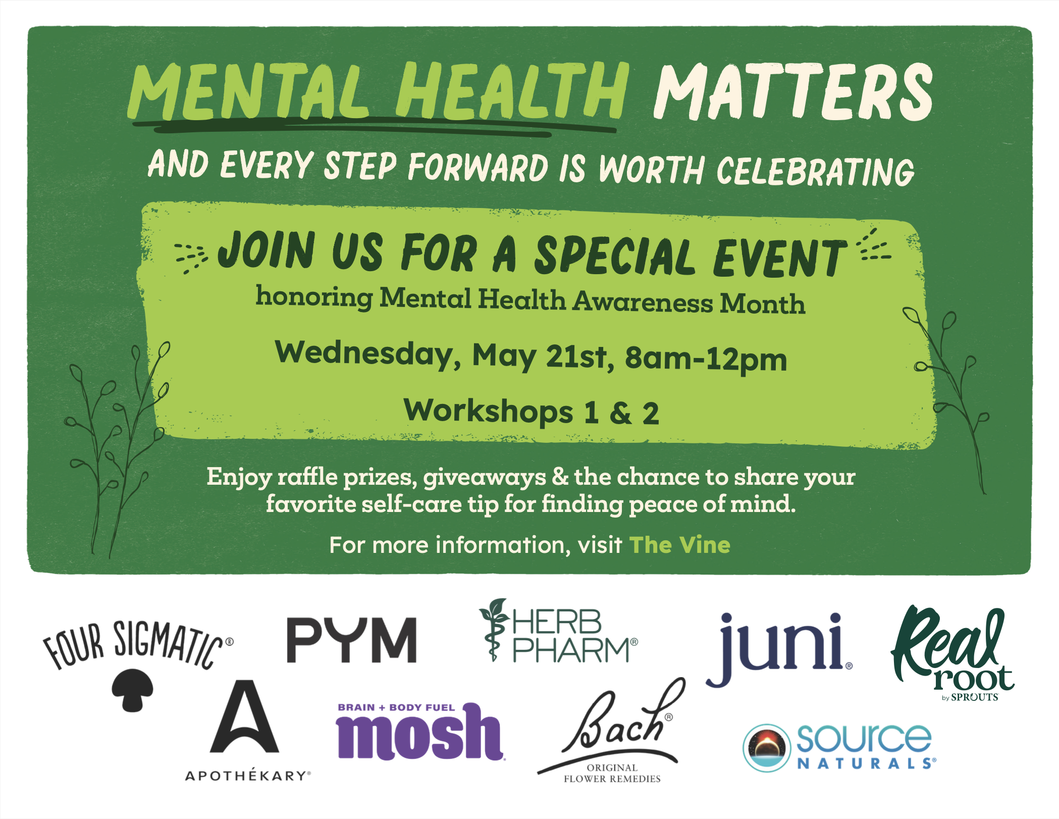 Join us to raise awareness for mental health and wellness at our Together for Mental Health: Planting Seeds of Support event on Wednesday, May 21 in the Workshops from 8am to 12pm.