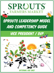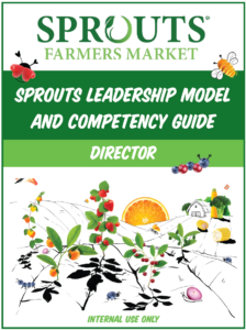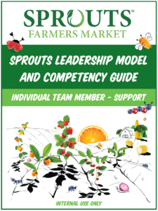 Use the Sprouts Leadership Model and Competency Guide for leading yourself, leading others, and managing the business. Each role specific guide includes competencies with key actions and behaviors, IDP examples, and development and leadership resources.